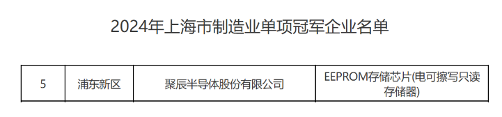 近日,上海市經濟信息化委正式公布2024年上海市制造業單項冠軍企業名單。聚辰半導體憑借其在EEPROM存儲芯片領域的卓越表現和突出成就,獲評2024年上海市制造業單項冠軍企業。